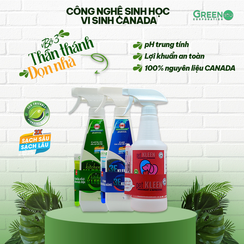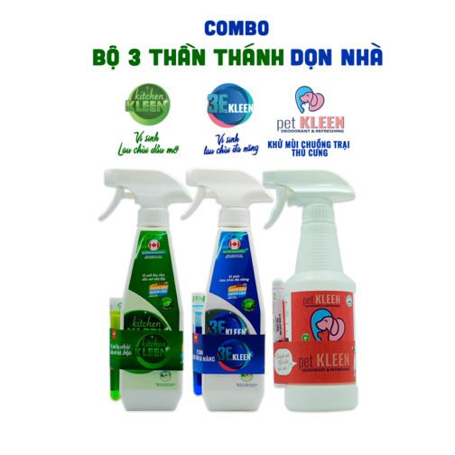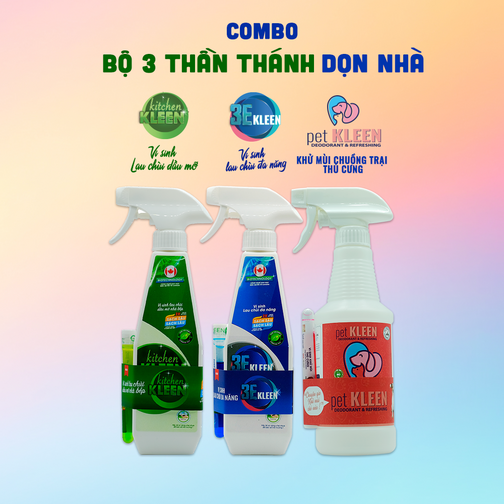 Tên sản phẩm: Combo bộ 3 thần thánh dọn nhà: Lau chùi dầu mỡ kitchen KLEEN – Vi sinh lau chùi đa năng 3E KLEEN – Khử mùi thú cưng pet KLEEN